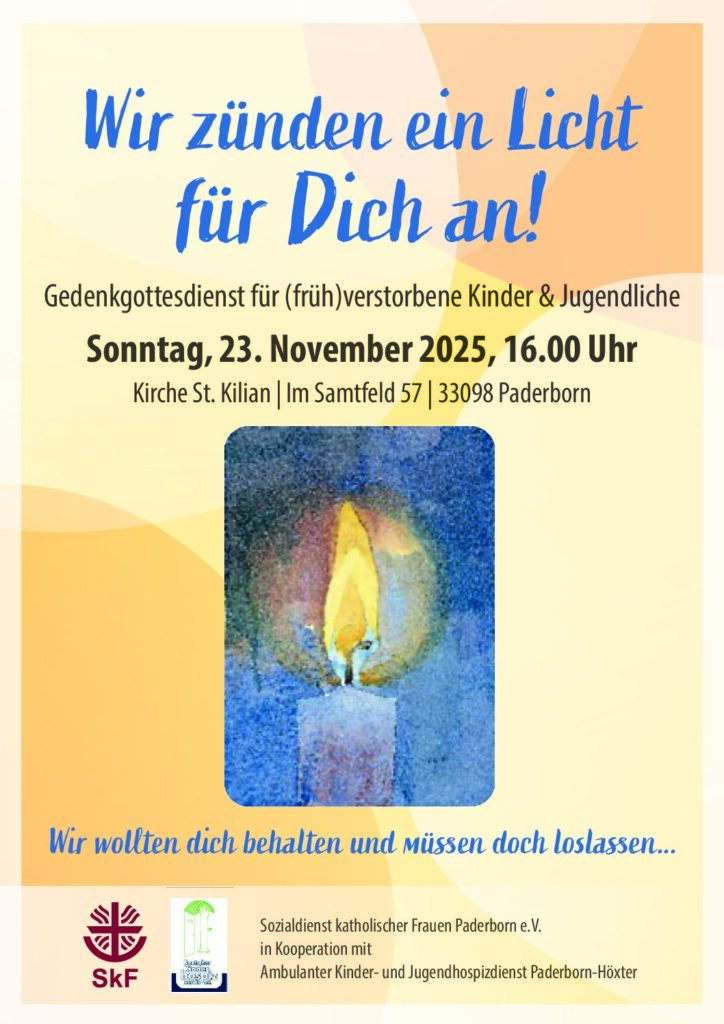 In diesem Jahr findet der Gedenkgottesdienst für (früh) verstorbene Kinder und Jugendliche am 23.11.2025 um 16 Uhr in St. Kilian, Im Samtfelde 57, 33098 Paderborn statt. Für betroffene Eltern nach Fehl- und Totgeburt oder kurzer Lebenszeit ihres Kindes bieten wir zudem einen offenen Trauergesprächskreis an. Das nächste Treffen findet am 22.10.2025 im SkF Beratungshaus, Kilianstraße […]