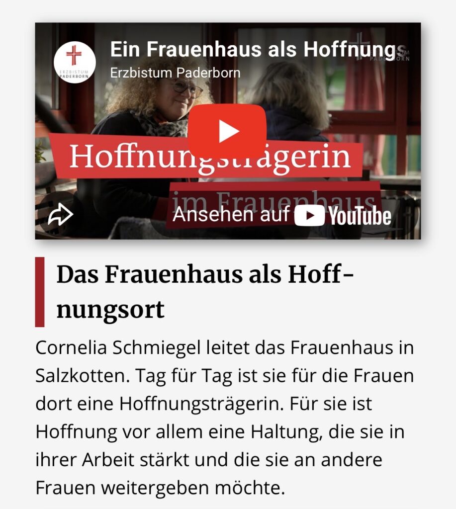 Im Rahmen des Heiligen Jahres 2025 zeigt das Erzbistum Paderborn „Orte der Hoffnung“ auf. Kann auch ein Frauenhaus ein Hoffnungsort sein? In jedem Fall! Im Filmbeitrag berichtet Cornelia Schmiegel aus ihren persönlichen Erfahrungen in der Arbeit mit gewaltbetroffenen Frauen in unserem Frauenhaus Salzkotten. Der Beitrag lohnt sich und stimmt hoffnungsvoll… Filmbeitrag